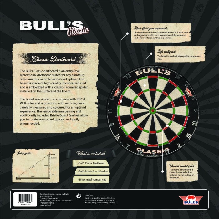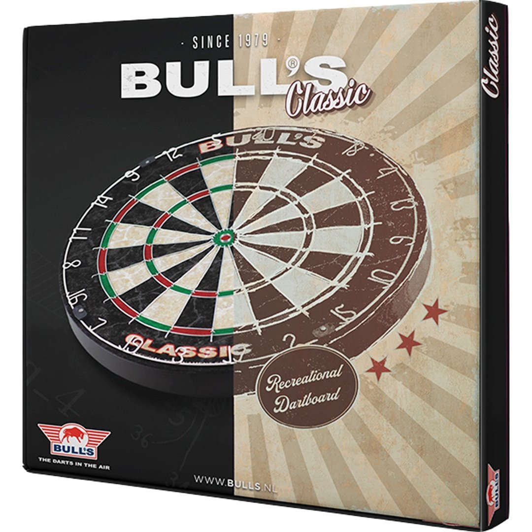 Bull's Classic Dartbord Het Bull's Classic Dartbord is een traditioneel bristle dartbord voor spelers die een betaalbaar en degelijk dartbord zoeken voor thuisgebruik. Dit model is vooral geschikt voor beginnende en recreatieve darters die een fijne basis zoeken om regelmatig te oefenen en vertrouwd te raken met het spel. Het dartbord is gemaakt van natuurlijke sisal en heeft een klassieke opbouw met traditionele ronde bedrading.
